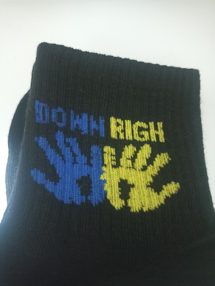 Koyu renkli, çok renkli baskılı çorap üzerinde 'DOWNRIGH' yazısı ve el desenleri bulunur. Diğer çeşitler için ilanlarıma bakınız