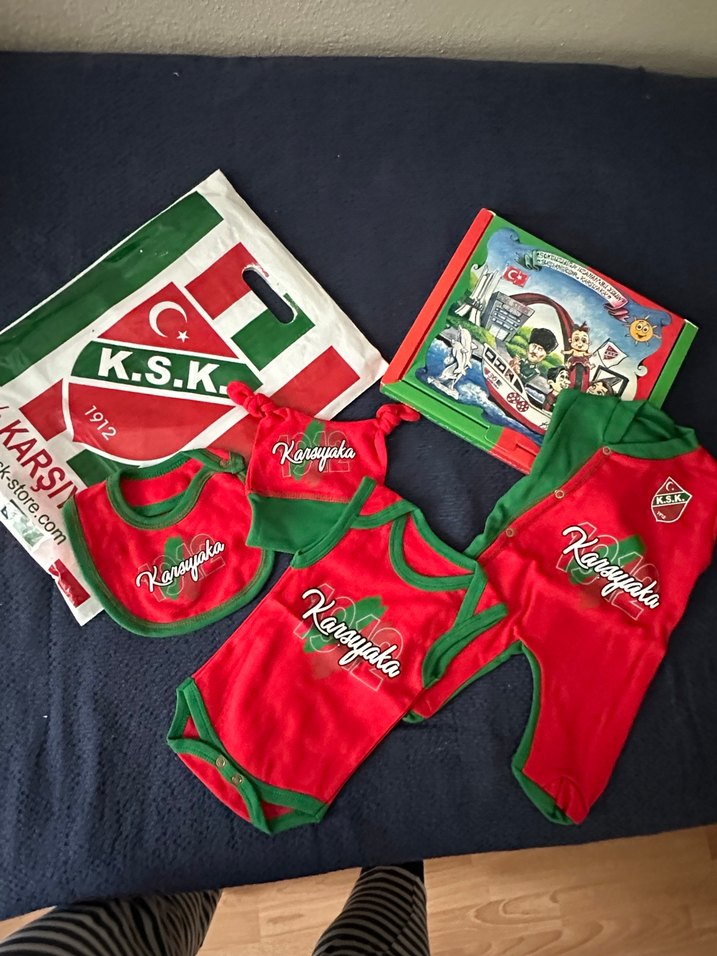 K.S.K. logosu bulunan kırmızı renkli bebek kıyafet seti; body, önlük, şapka ve tulum içerir.