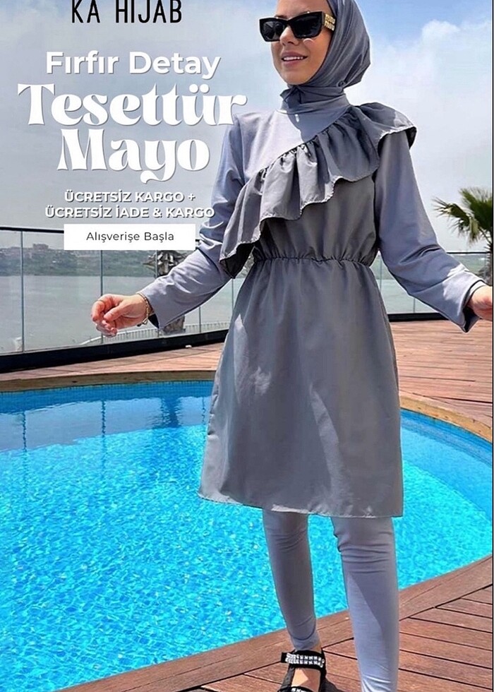 Markası kahijabdır. L bedendir fkat dar kalıp oldugu için M beden uyumlu oldugunu düşünuyorum. 2 parça halindedir alt ve üst şeklinde. Alt kısmı tayttır. Gri renkli