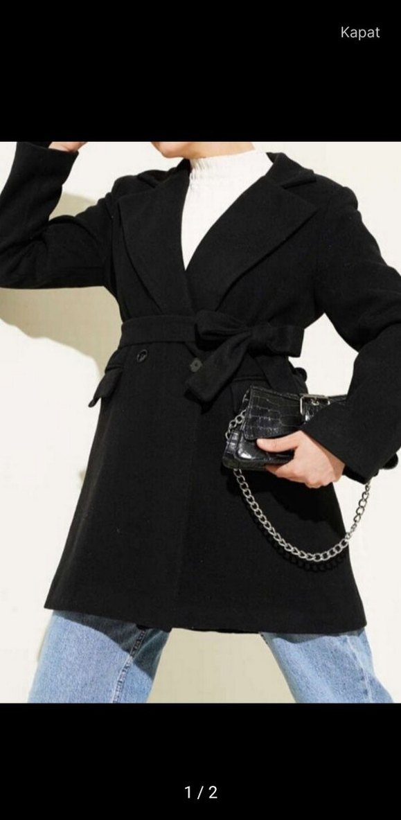 Siyah kuşaklı, uzun kollu ve yaka detaylı kadın kabanı. Ön cepleri ve dar kesimi ile günlük kombinlere uygundur. Defosu yoktur 46 bedendir 80 cmdir