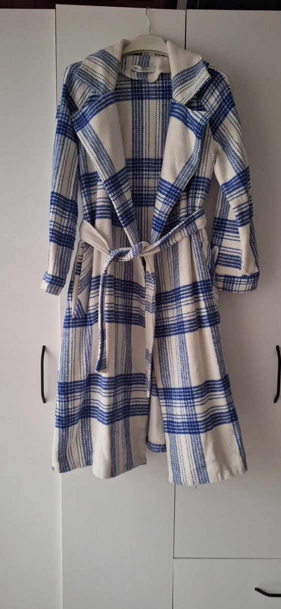 Mavi ekoseli , yumuşak dokulu kaban dügmesiz önden bağlamalı 40 ile 44 bedene kadar uygundur.