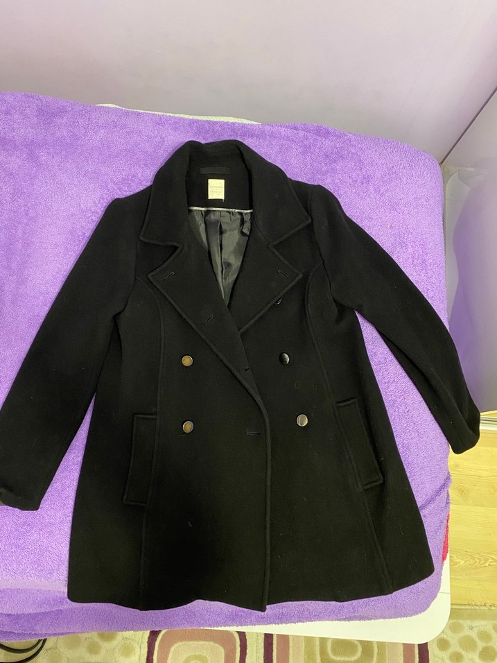 Klasik yakalı, çift düğmeli siyah kaban, yan cepler ve iç astar ile rahat kullanım sağlar.