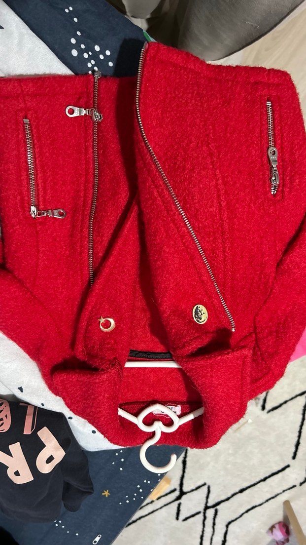 Kırmızı, fermuarlı, diz hizasında, uzun kollu, yumuşak ve sıcak kumaştan, rahat sokak stiline uygun kadın ceketi.