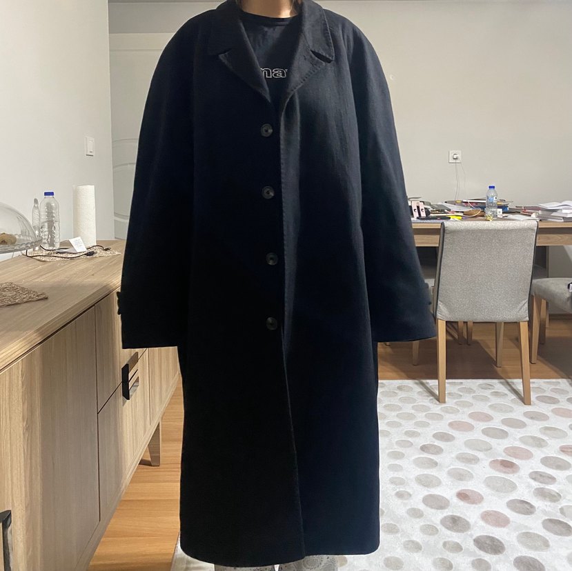 Erkek siyah keten kaban, düğmeli ve klasik kesim, normal uzunlukta, uzun kollu, ofis kullanımı için uygundur.