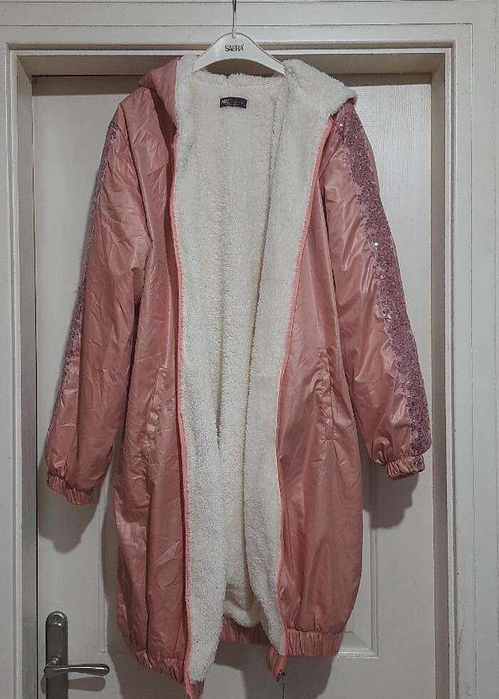 Uzun zarif ici peluş kaban.nokta sorunu yok.giyilmedi cunku. 40/42 bedene uygun.etek kismindaki lastik cok sıkı olmamakla birlikte, önü kapatildiginda,buyuk pop.lu hanimlarda hoş durmayabilir.yumusacik bir parça
