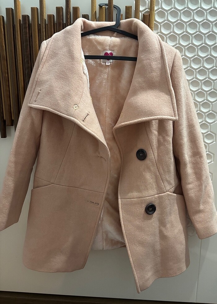 Pudra pembe kaban yakasında peluşu var bulunca paylaşırım 1kez giydim çok temiz yumuşacık