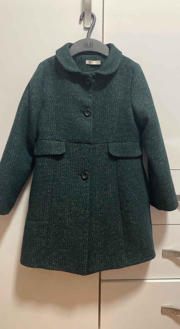 Düğmeli, koyu yeşil yünden yapılmış kabanı. Notlu yakalı, uzun kollu, midi boyda ve rahat kesimdir. Ofis için uygundur. 6-7 yaş kotondan aldık 1-2 kez kullanıldı yepyeni duruyor