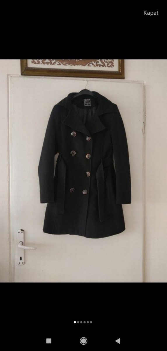 Siyah, çift sıra düğmeli, klasik yakalı ve uzun kollu sıcak kumaşta kaşe kaban..1düğmesi eksik Astarlı M beden