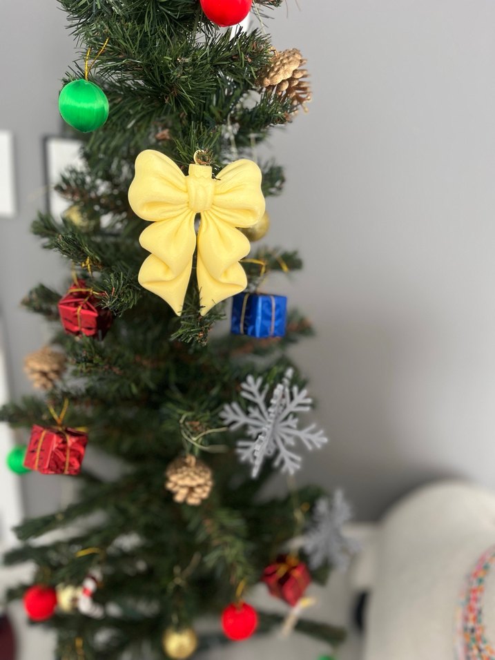 Pastel sarı renkte, kabarık kurdele detaylı bu üçlü Noel süsü o kadar tatlı duruyor ki ağaca, kapıya, hatta hediye paketlerine bile çok yakışıyor. Yumuşak rengiyle her yılbaşı dekoruna uyum sağlıyor. Kabarık formu sayesinde çok sevimli bir görünüm oluşturuyor. ✨ Hafif ve dayanıklı 3D baskı malzemeyle üretilmiştir.