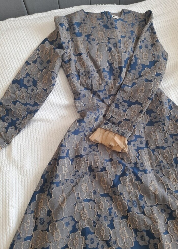 Hem şık davetlerde hemde günlüğe uyarlayabileceginiz kol kısımları tül detaylı mavi ve sarının uyumlu dokulu elbise
