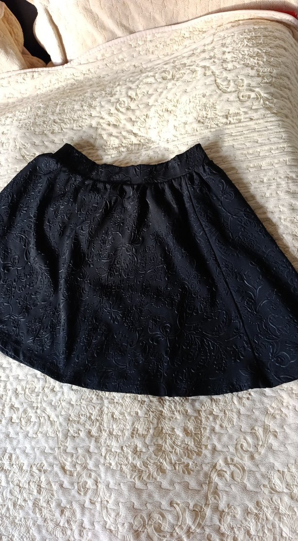 Sentetik kumaştan, kabartma Gül desenli ,daire kloş, siyah renkli, midi etek. Gotik tarzda, her ortam için kullanıma uygundur.