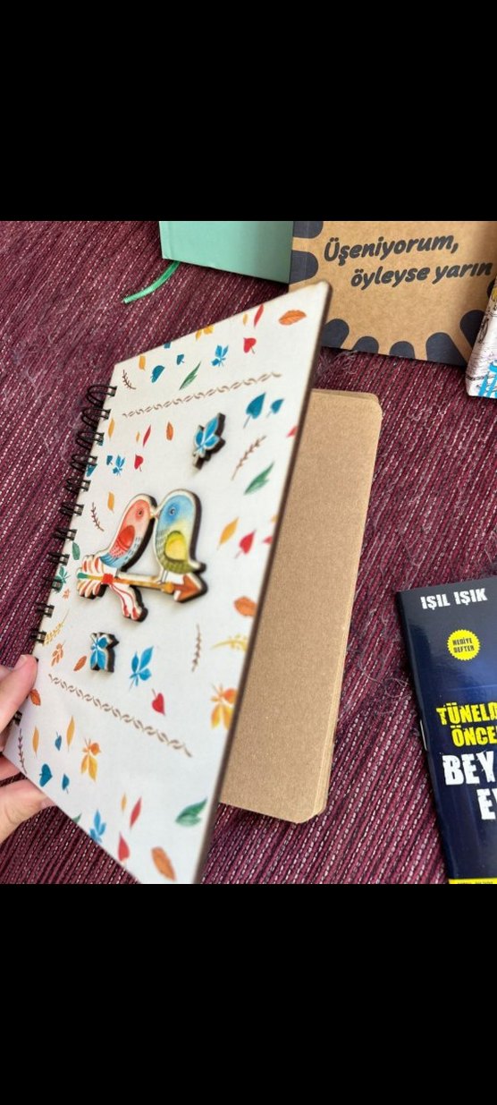 Spiralli renkli kapaklı,kahverengi yapraklı düz defter bi kaç sayfa kullanıldı