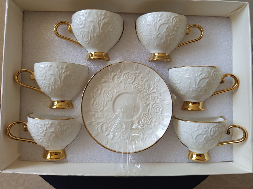 Kabartmalı çiçek desenli beyaz porselen fincan takımı, kulplarında ve kenarlarında altın detaylar bulunur. ☕