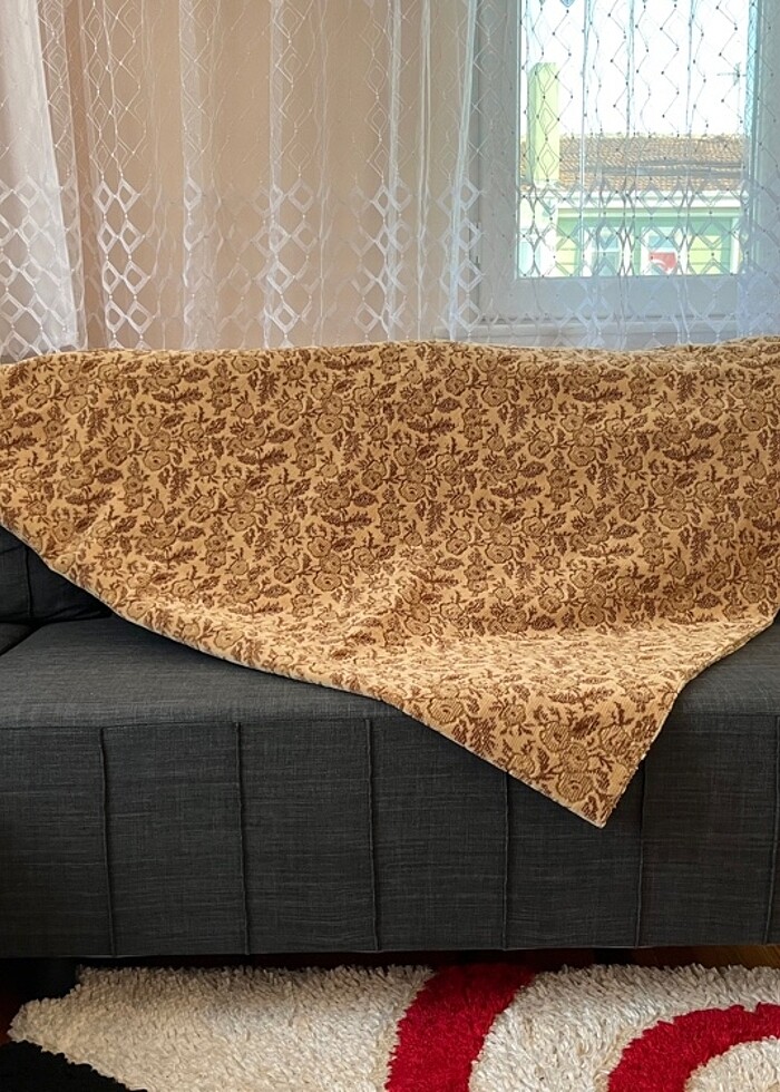 140x320cm. Kabartmalı kadife kumaş. Kahve-krem tonlarındadır. Fon perde veya yatak örtüsü olarak kullanılabilir. Sıfır üründür