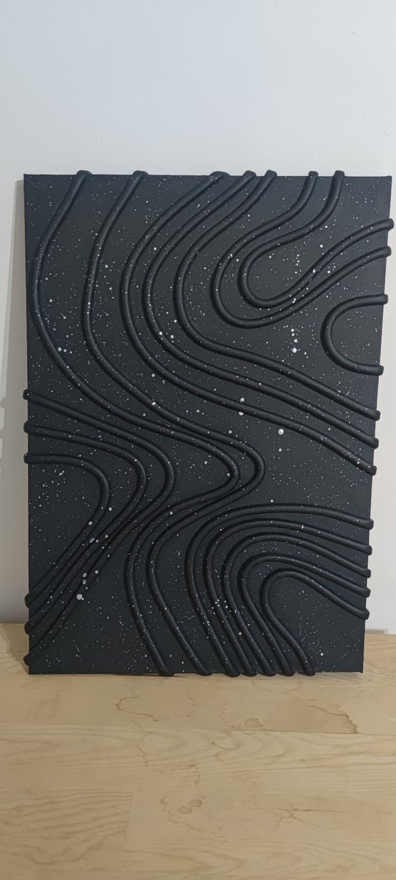 Kabartmalı kıvrımlı çizgiler ve beyaz lekelerle siyah soyut tablo, dokulu ve dinamik bir görünüm sunar. 35×50 tuval üzerine izolasyon bandı ile doku verilip akrilik boya ile boyandı. istenilen renk model ve boyutta yapılır