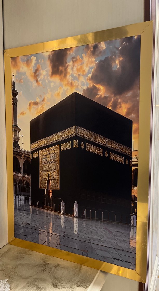 Gün batımı ve bulutlar eşliğinde Kabe'nin çerçeveli posteri. Altın renkli çerçeve ve etrafta hacılar yer alıyor.