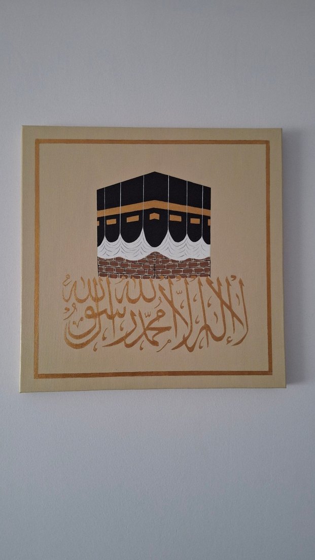 Kabe'nin detaylı çizimi ve Arapça hat yazısı bulunan, koyu camel renkli ve uyumlu kenarlıklı tablo. El emeği, 25×35 boyunda sipariş alınır.