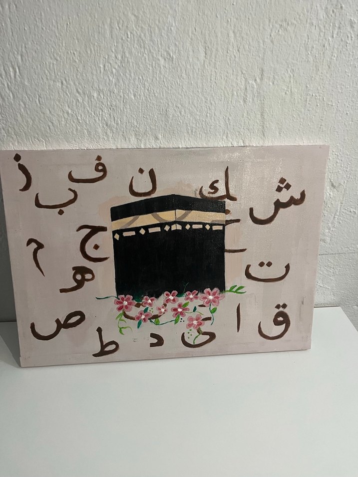 Kabe'nin siyah figürünün yer aldığı, beyaz zeminde Arap harfleri ve pembe çiçeklerle süslenmiş el boyaması tablo. Tasarımda 'b' harfi bulunur.