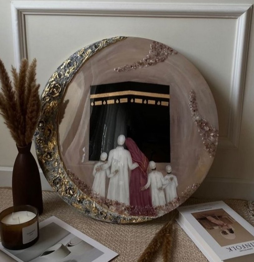Parlak beyaz figürin, Kabe önünde duran insan figürlerini ve altın-pembe detayları yuvarlak tabanda gösterir. sevdikleriniz ve kendiniz için mükemmel bir hediye. istediğiniz modeli gönderin yapalım. (resim pinterest'ten alınmıştır istediği yerde yapılacaktır)