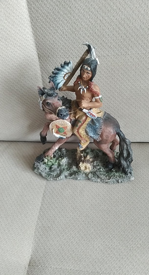 Kabile savaşçısını at üzerinde gösteren, koyu deve tüyü tonlarında ve geleneksel kıyafetli detaylı figürin. Savaşçı mızrak ve süslü kalkan tutuyor.