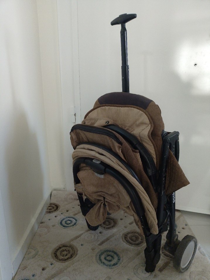 Katlanabilir tasarıma sahip kahverengi ve gri bebek arabası, seyahat ve saklama için uygundur.