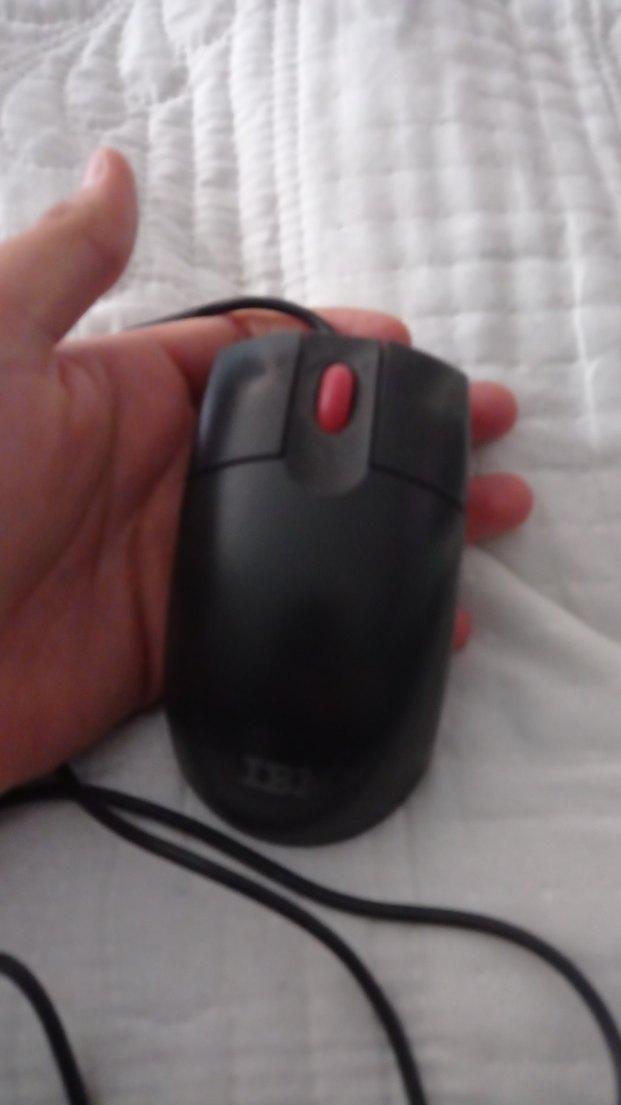 Kablolu gri IBM bilgisayar mouse'u, kırmızı kaydırma tekerleğiyle konforlu kullanım sunar. ️