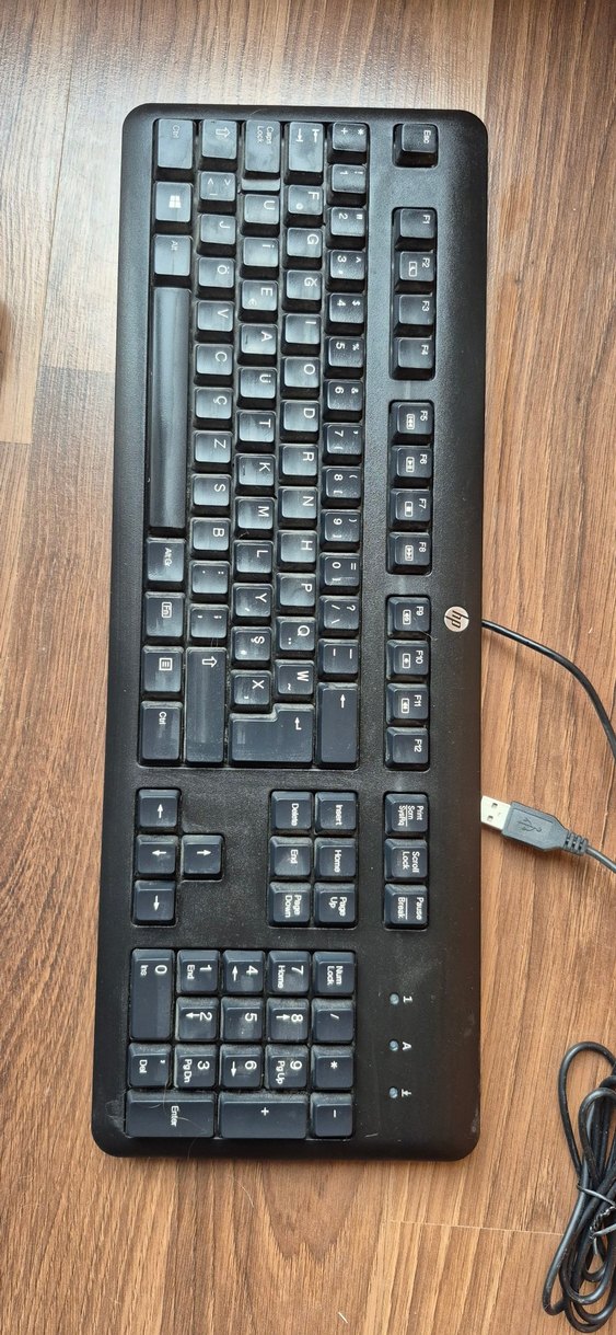 USB bağlantılı, sayısal tuş takımı ve standart düzenli koyu kahverengi HP f klavye. ⌨️