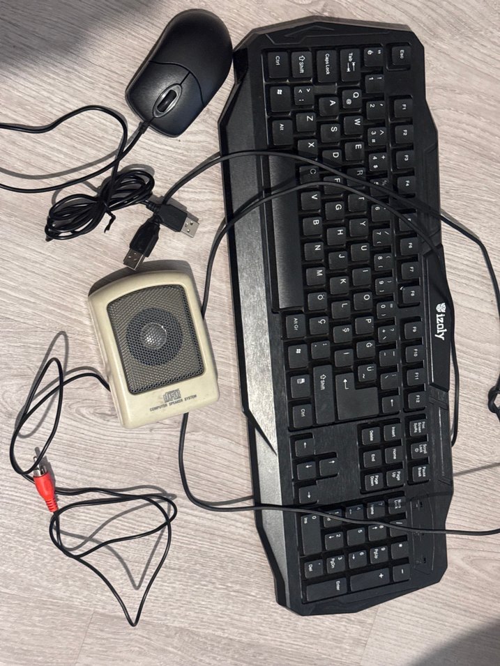Kablolu siyah klavye, siyah kablolu mouse ve küçük harici hoparlör. Klavyede beyaz yazılı standart tuş düzeni bulunur.