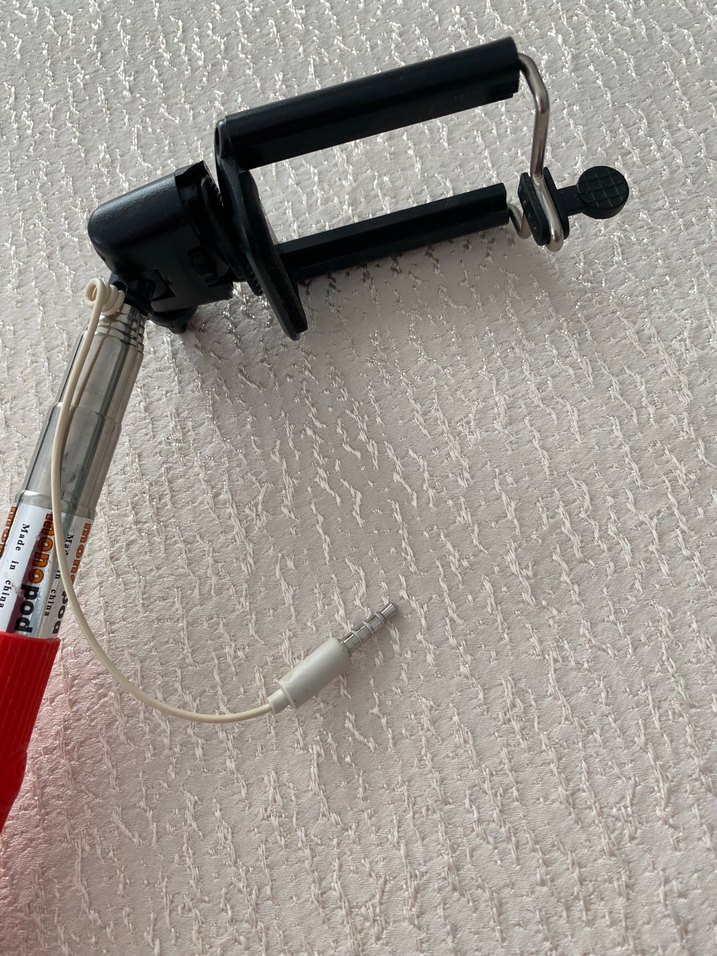 Kablolu bağlantıya sahip kırmızı selfie çubuğu, sağlam telefon tutucu ve ayarlanabilir mandalla dikkat çekiyor.