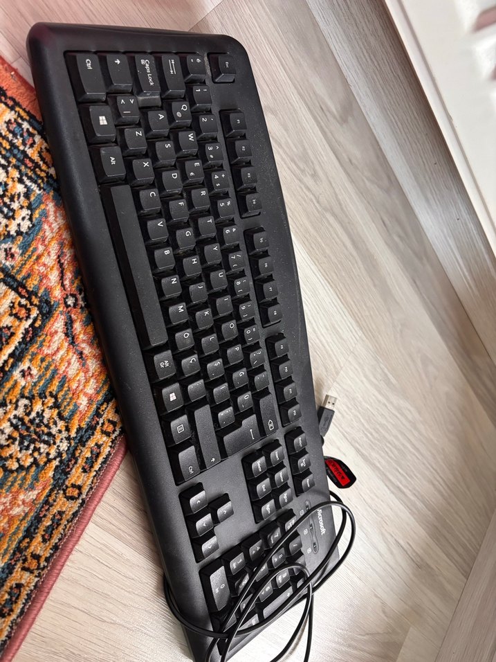 USB bağlantılı, tam standart düzenli siyah kablolu klavye. Üzerinde beyaz harfler bulunan koyu tuşlara sahiptir. ⌨️
