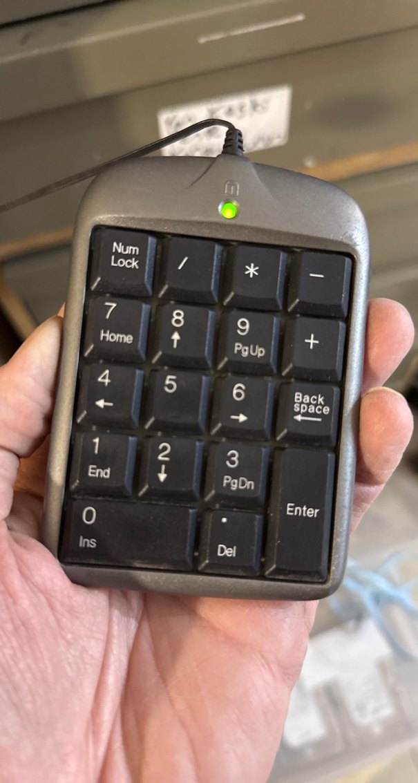 Kablolu ve gri renkte sayısal tuş takımı, sayılar ve navigasyon tuşları içerir. Yeşil gösterge ışığı bulunur.