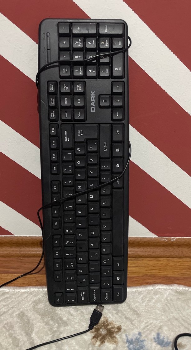 Kablolu bağlantıya sahip siyah Dark klavye, tam QWERTY düzeninde standart tuşlarla günlük kullanıma uygundur. ⌨️