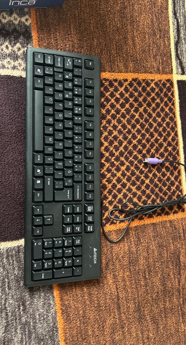 Kablolu, koyu renk tuşlara sahip kahverengi kasalı standart düzen klavye. PS/2 bağlantı noktası içerir. ⌨️