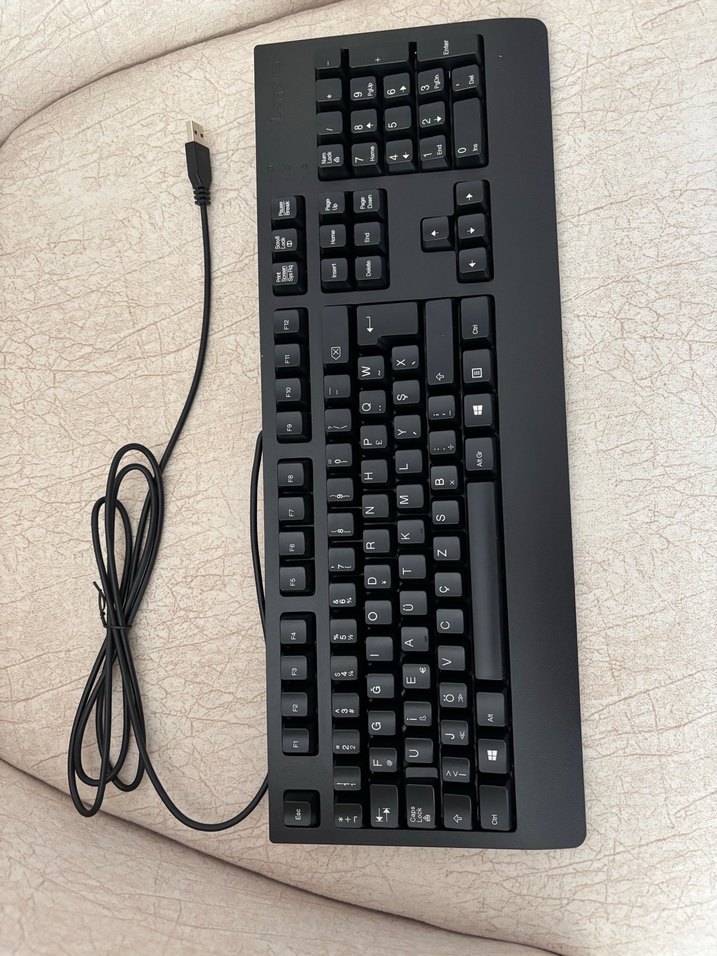 Kablolu siyah klavye, tam tuş takımı ve sayısal tuş takımı içerir. USB bağlantısıyla kullanılır, şık ve koyu renk tasarıma sahiptir. ⌨️