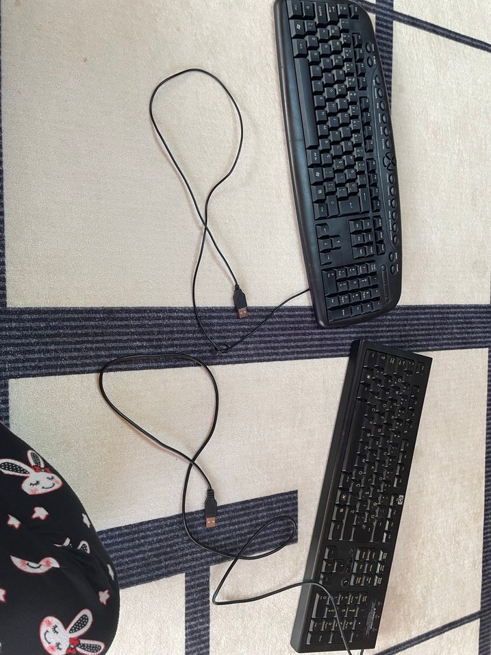 İki adet kablolu siyah klavye, standart tuş düzeni ve USB bağlantısı ile rahat kullanım sağlar. ⌨️