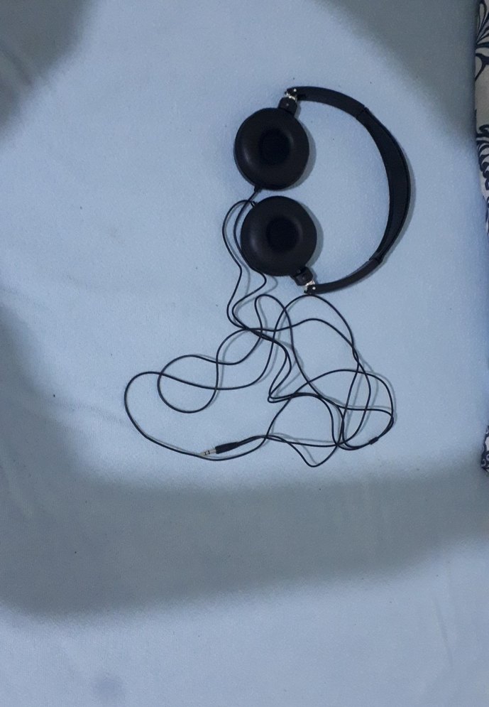 Konforlu yumuşak kulak pedlerine sahip siyah kablolu kulaklık .