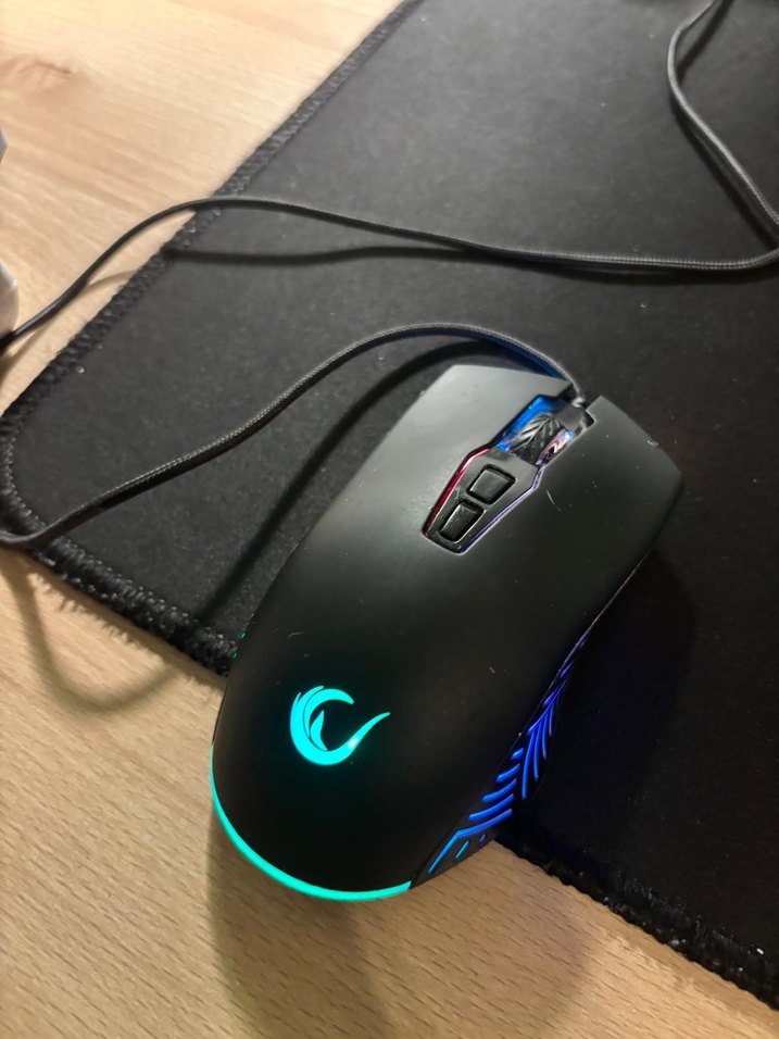 RGB aydınlatmalı, ek tuşlara sahip kablolu siyah oyun mouse'u. Rahat tutuş ve hassas izleme sağlar. ️