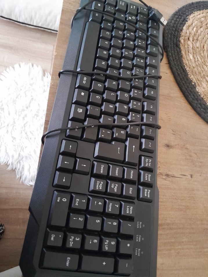Sayısal tuş takımı ve fonksiyon tuşları bulunan siyah kablolu standart klavye. Beyaz harfli koyu tuşlara sahiptir. ⌨️