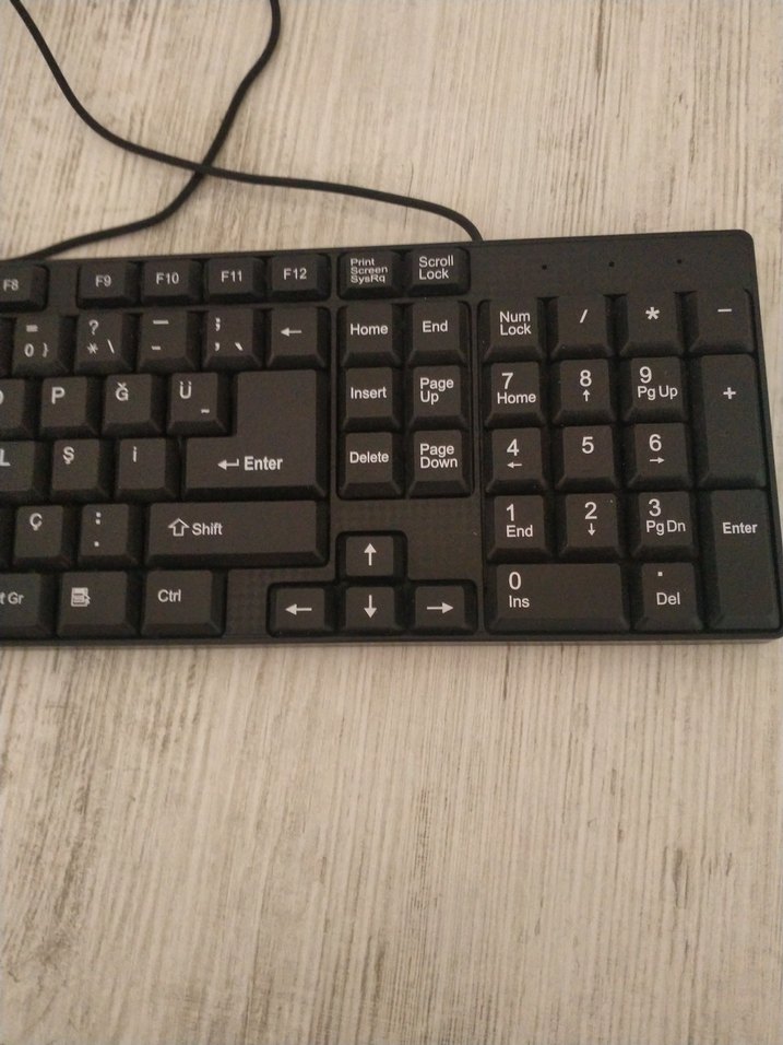 Bu siyah kablolu klavye, tam sayısal tuş takımı ve Enter, Ctrl, yön tuşları gibi standart tuşlara sahiptir. Fonksiyon tuşları ve kilit göstergeleri bulunur.