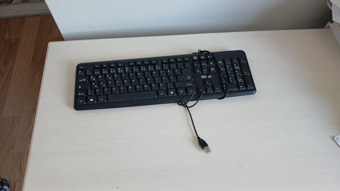 USB bağlantılı siyah kablolu klavye, standart tuş düzeni ile rahat yazma sağlar. ️