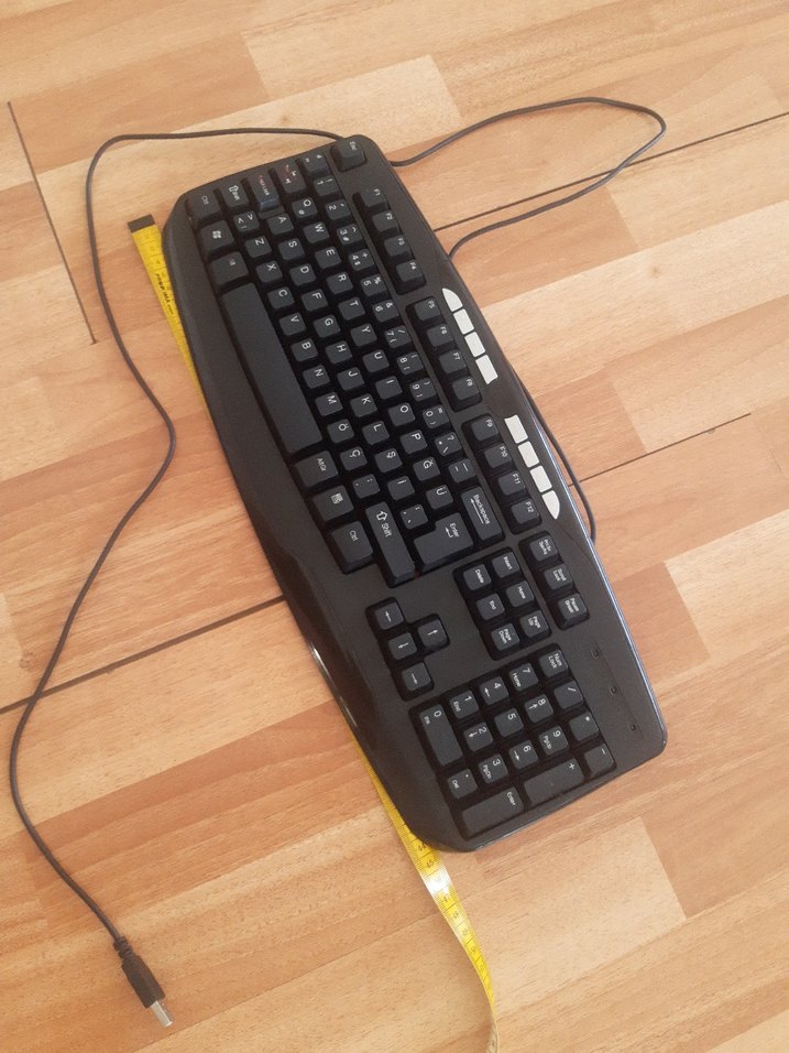 Tam düzen ve sayısal tuş takımı içeren, USB bağlantılı siyah kablolu klavye. ⌨️