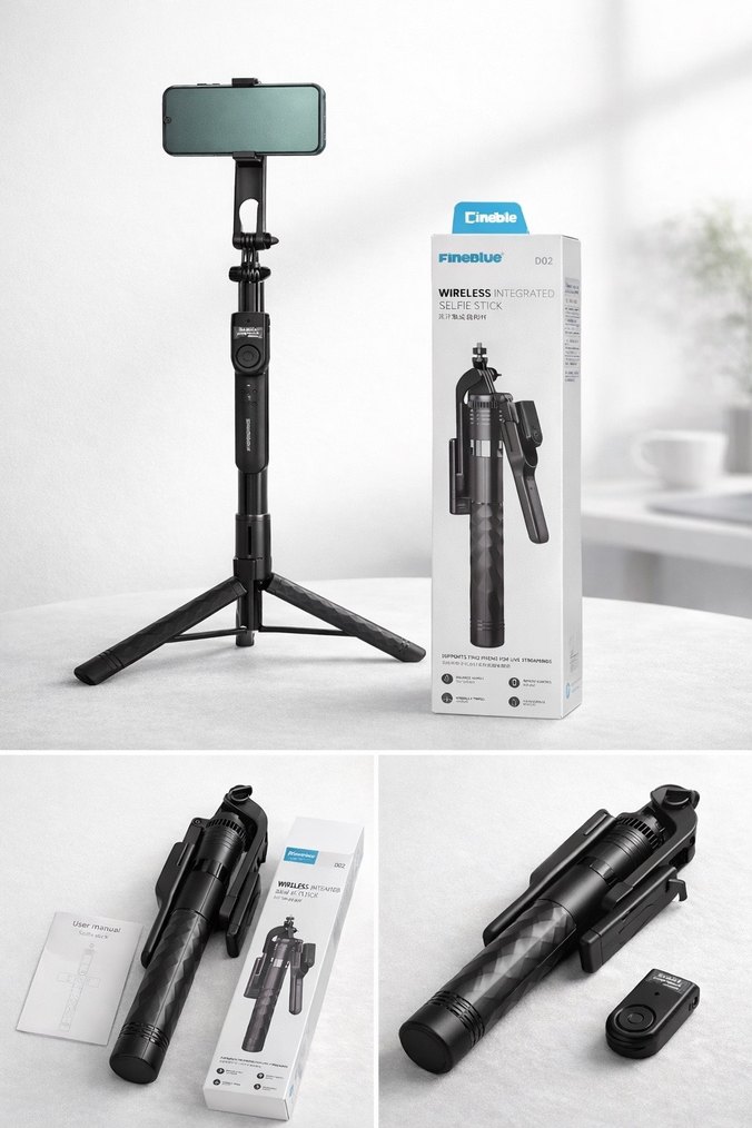 Kablosuz kumandalı ve entegre tasarımlı siyah selfie çubuğu ve tripod. Kompakt, uzatılabilir ve stabil çekimler için uygun.