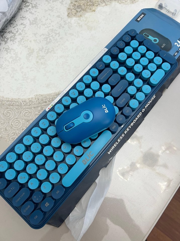 Turkuaz renkli, retro daktilo stili yuvarlak tuşlara sahip kablosuz klavye ve uyumlu mouse’tan oluşan set. Şık tasarımıyla masaüstüne nostaljik bir hava katar. Hiç kullanılmadı, sıfır ve sorunsuzdur.