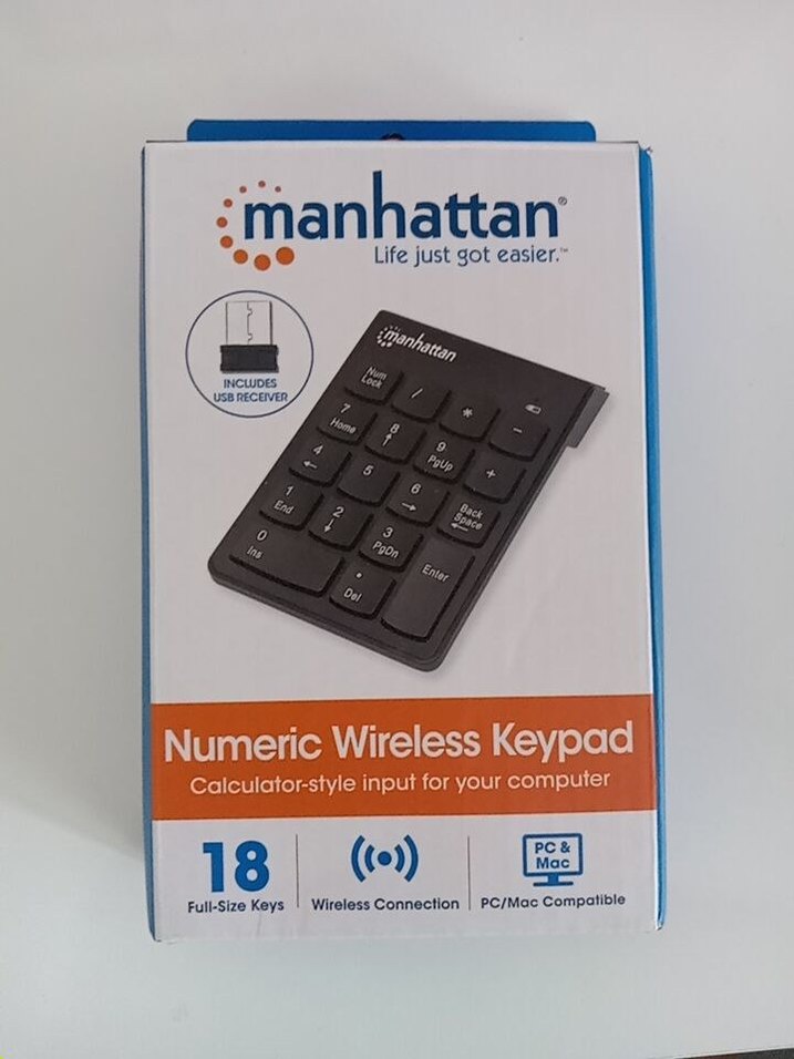 Manhattan kablosuz sayısal klavye, 18 tuşlu ve 2.4 GHz kablosuz frekansla çalışır. Siyah renk ve kompakt tasarıma sahiptir. Wireless numeric keypad denen, üzerinde sadece rakamlar olan klavye. Sadece denemek için kullanıldı, onun dışında hiç kullanılmadı. Orijinal kutusunda, pili ve kılavuzu ile gönderilecektir.