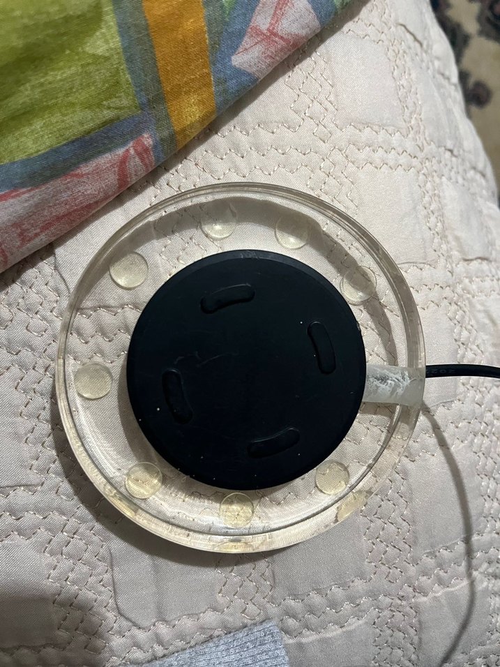 Dairesel şeffaf tabanı ve koyu renkli merkezi şarj pedi olan siyah telefon şarj cihazı. ⚡hiç kullanılmamıştır