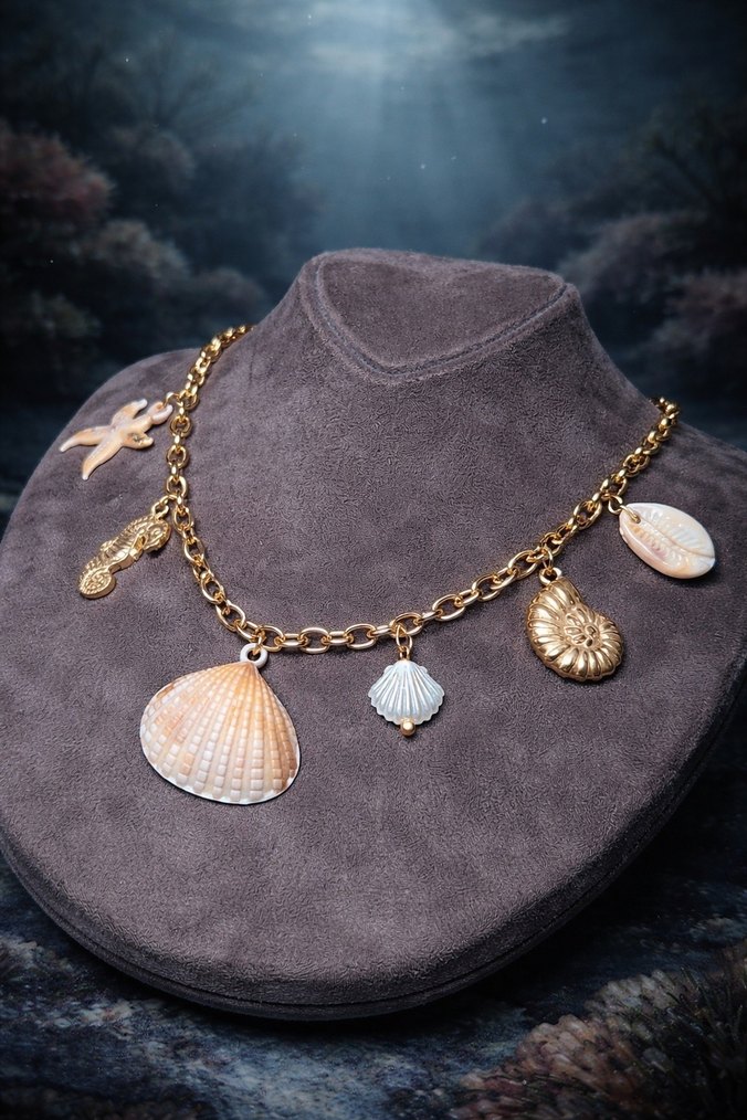 Kısa uzunlukta, kabuk ve denizyıldızı figürlü nakışlı altın zincir kolye. Bohem, retro ve ışıltılı plaj tarzını yansıtır.