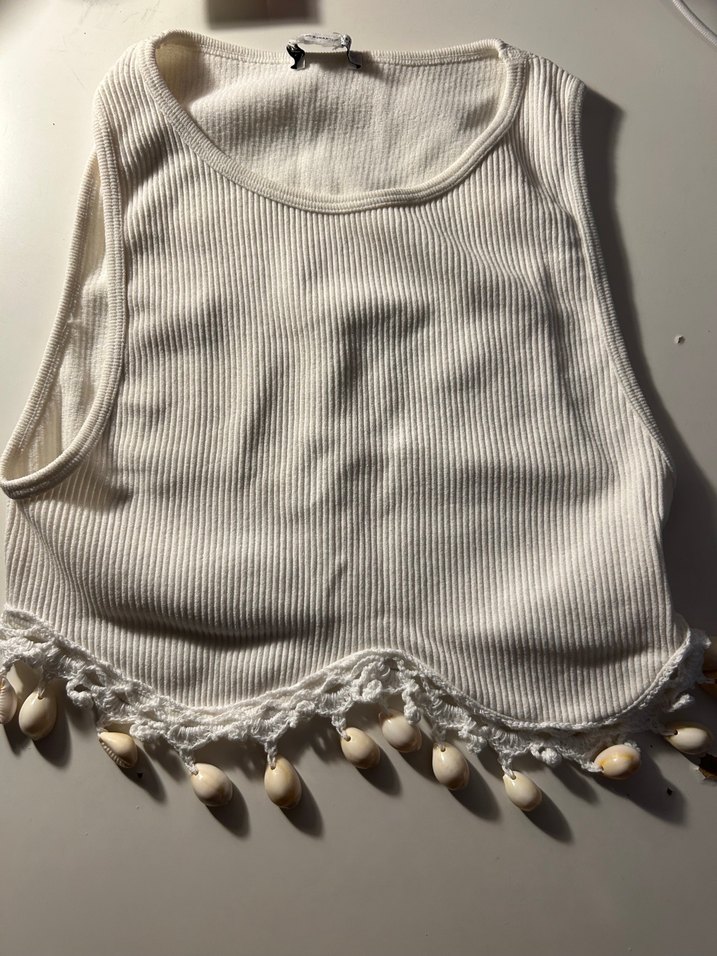 Örme kumaştan, kolsuz ve yüksek yakalı, deniz kabuğu detaylı bohem tarzda, beyaz-gri tonlarında, vücuda oturan kadın atlet.esnek kumaştir