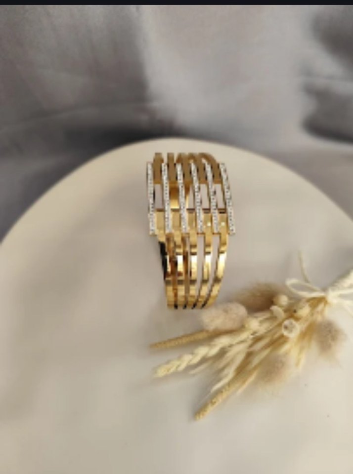Parlak altın renkli, tokalı ve soyut desenli minimal ve çağdaş bileklik. Düğün ve şık etkinlikler için uygun. ✨