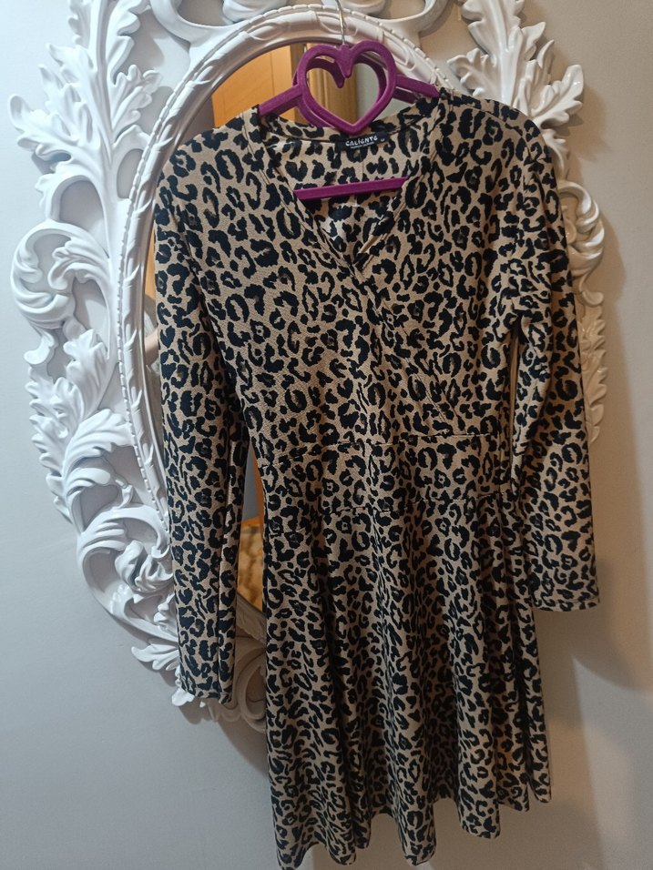 Koyu kahverengi leopar desenli, uzun kollu elbise