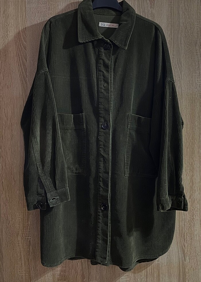 Haki, kadife ceket L bedene uygun, oversize. Uzun zamandır giyilmesinden kaynaklı dirseğinde solma mevcut onun dışında kusuru yok